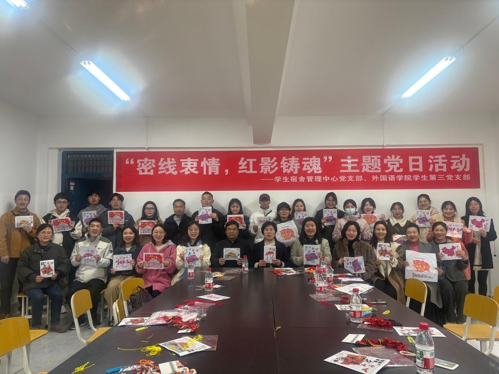 12月17日下午,学生宿舍管理中心党支部与外国语学院学生第三党支部在麓南校区南5舍共同开展了一场“密线衷情,红影铸魂”主题党日活动。双方支部共30多名党员、学生宿舍管理中心值班员代表参加活动。