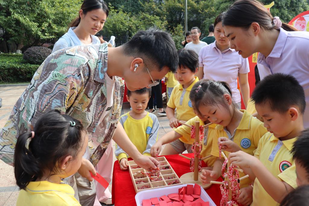 9月28日,30余名大班幼儿走进铁路园,和交通运输工程学院的大学生们一起为祖国庆生。孩子们作为“小小发起者”,“带领”哥哥姐姐完成红歌传唱、温暖留言、红色知识问答等互动项目,并为他们佩戴上特制的纪念徽章或红色手串。这一互动不仅是任务的完成,更是一场荣誉的授予,象征着红色基因在两代人之间的传递与共鸣,让爱国的种子在童心中生根,让文化传承在青春接力中焕发新生。