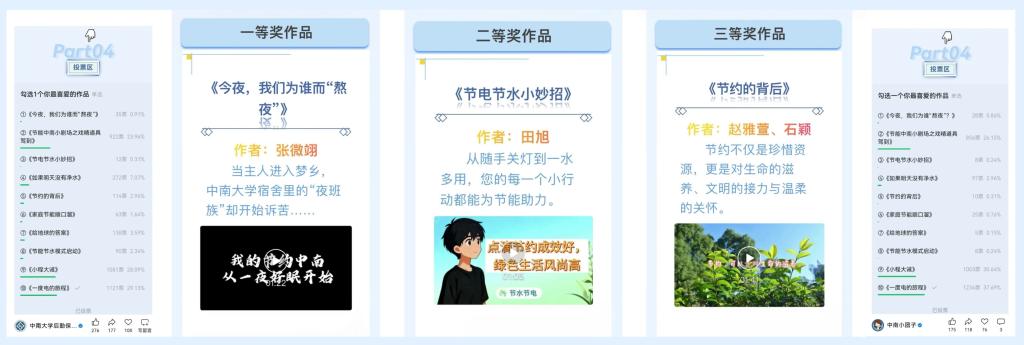 同时,由后勤保障部牵头,联动党委宣传部、学工部、校团委、建筑与艺术学院等多部门举办的《我的“节约中南”故事》微视频比赛也圆满收官,比赛吸引了近8000名师生踊跃参与、投票比拼,最终评选出《一度电的旅程》《小程大诫》2部最受欢迎奖作品。