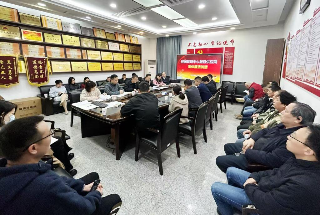 3月31日,校园管理中心组织召开服务供应商廉洁集体谈话,后勤保障部纪委办公室副主任陈鹏、校园管理中心主要负责人、关键岗位代表及服务供应商共计28人参会。
