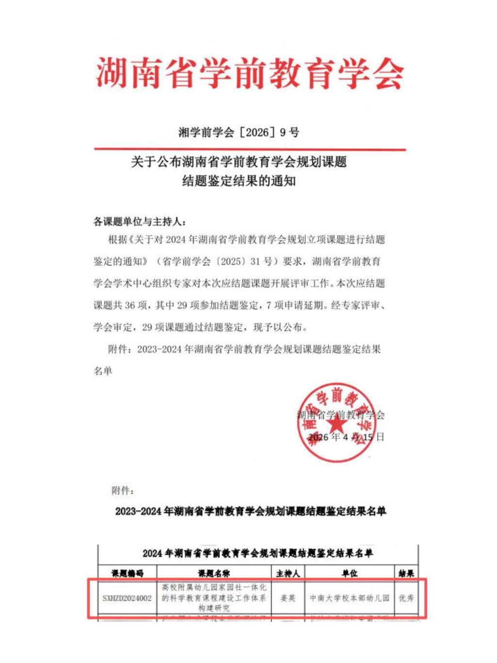 4月15日,后勤保障部校本部幼儿园承担的湖南省学前教育学会规划重点课题——《高校附属幼儿园家园社一体化的科学教育课程建设工作体系构建研究》顺利通过结题鉴定,获评“优秀”等级。这是继“十四五”规划课题优秀结题、教育教学改革项目成功立项之后,幼儿园在教科研领域取得的又一重要突破。